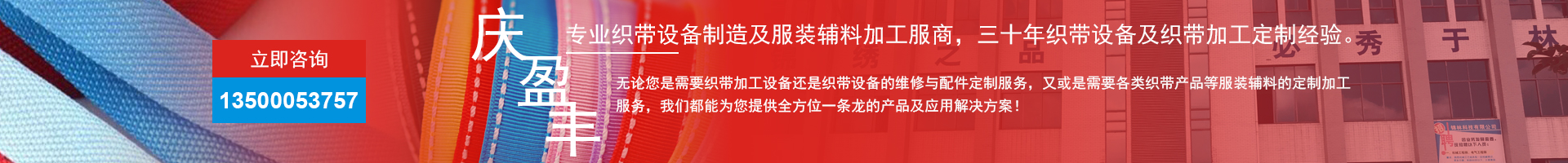 深圳市慶盈豐科技有限公司和湖南錦林科技有限公司是多年生產和經營各類織帶機設備、織帶機器配件為主的專業廠商,兼營其他各類紡織機械設備器材配料、紡織原料及輔料的公司,同時也為客戶提供各類織帶產品及輔料的加工生產一站式服務,主要產品和經營項目為:各類普通、加重、高速、重磅、超高速、等各款無梭織帶機;拉鏈、鞋帶、鍛帶、窗簾帶、消防水帶等各種專用織帶機;機械提花機、電腦提花機、粘扣帶機、電腦打孔機、高速圓盤機、高速圓盤繩帶機、拉鏈中心線機、針通機、扭繩機等各種型號主導織帶機械。粘扣帶整經機、起毛機、切勾機、定型機、分條機、背膠機、高壓染缸、經紗機、經膠機、卷帶機、分紗機、加網機、漿燙機、熱切帶機、圓筒卷帶機、解帶機、臘帶機、橫式包裝機、搖擺包裝機、打孔機等各種織帶輔助機械設備。